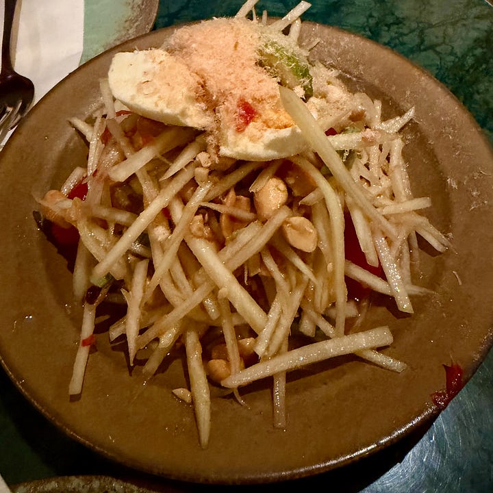 Fortunately, when our server finally appeared, she was amazing, pulling out her own phone and cross-referencing gluten-free menu options. I was ready to order the chicken skewers — traditional Ping-Yang — since they were marked as gluten-free. But our server cautioned that because the same grill was used for other things that there was a risk of cross-contamination. Instead, she guided me to safer choices, which included the Laab Ped Udon (crispy fat-fried duck with fresh veggies, served into lettuce leaves as a DIY wrap), and the Tum Thai Kai Kem (a green papaya salad with tomatoes, long beans, lime, peanuts, and creamy salted egg — don’t be fooled, it is FIERY). I had the Sonsri cocktail, a frozen confection of pureed guava, tequila, cointreau, spicy plum, and lime zest, and it was sweet counterpoint.